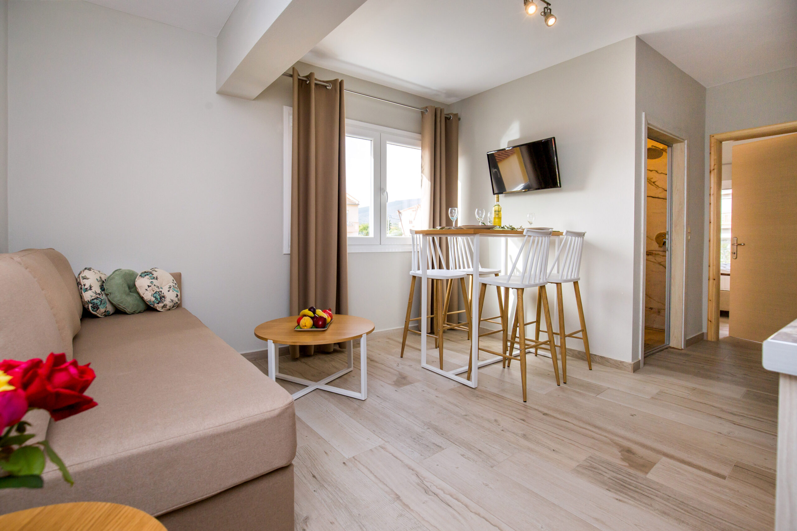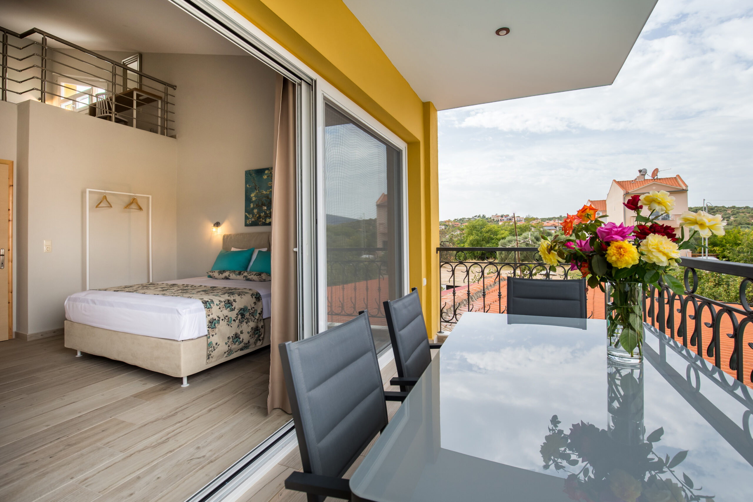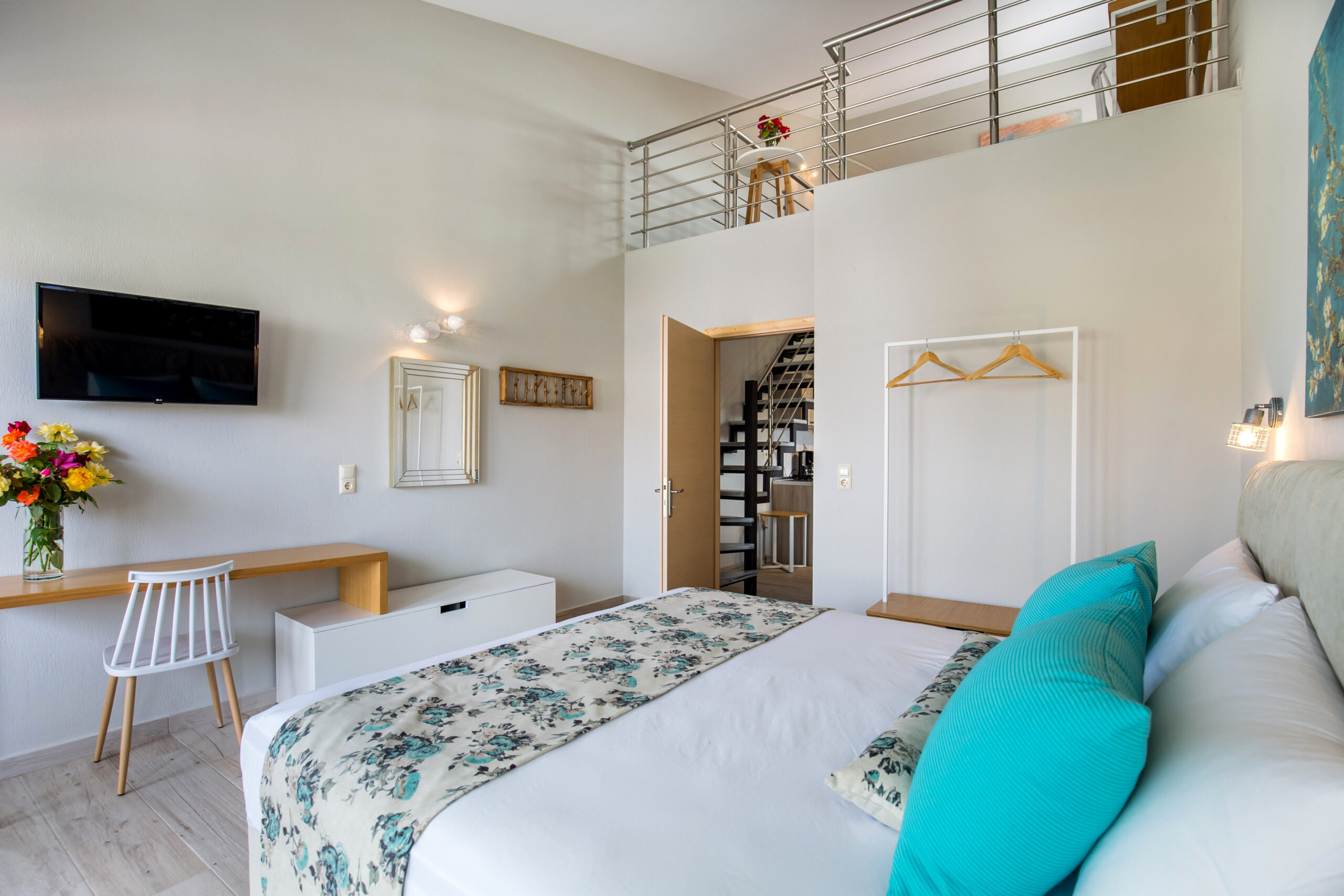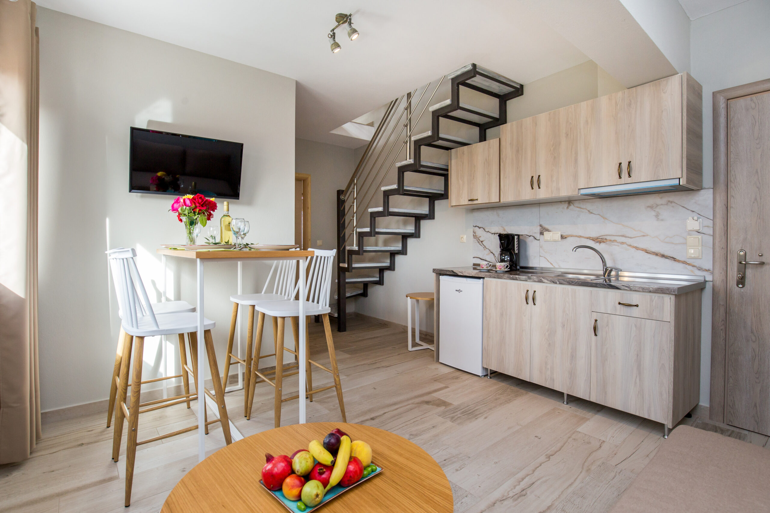 This apartment provides exceptional accommodation for families or groups of friends, since it can accommodate up to six persons. It features a spacious living room with a sofa bed, a modern, fully equipped kitchen with all the necessary kitchen utensils and a bar counter with chairs. The main bedroom features a double bed. The windows that surround the entire apartment capture the natural light. It also has a modern en-suite bathroom. The access to the upper floor is from the staircase at the kitchen. The upper floor also features a double bed. Lastly, the apartment has direct access to a spacious furnished balcony, overlooking the village and the beautiful natural surroundings.