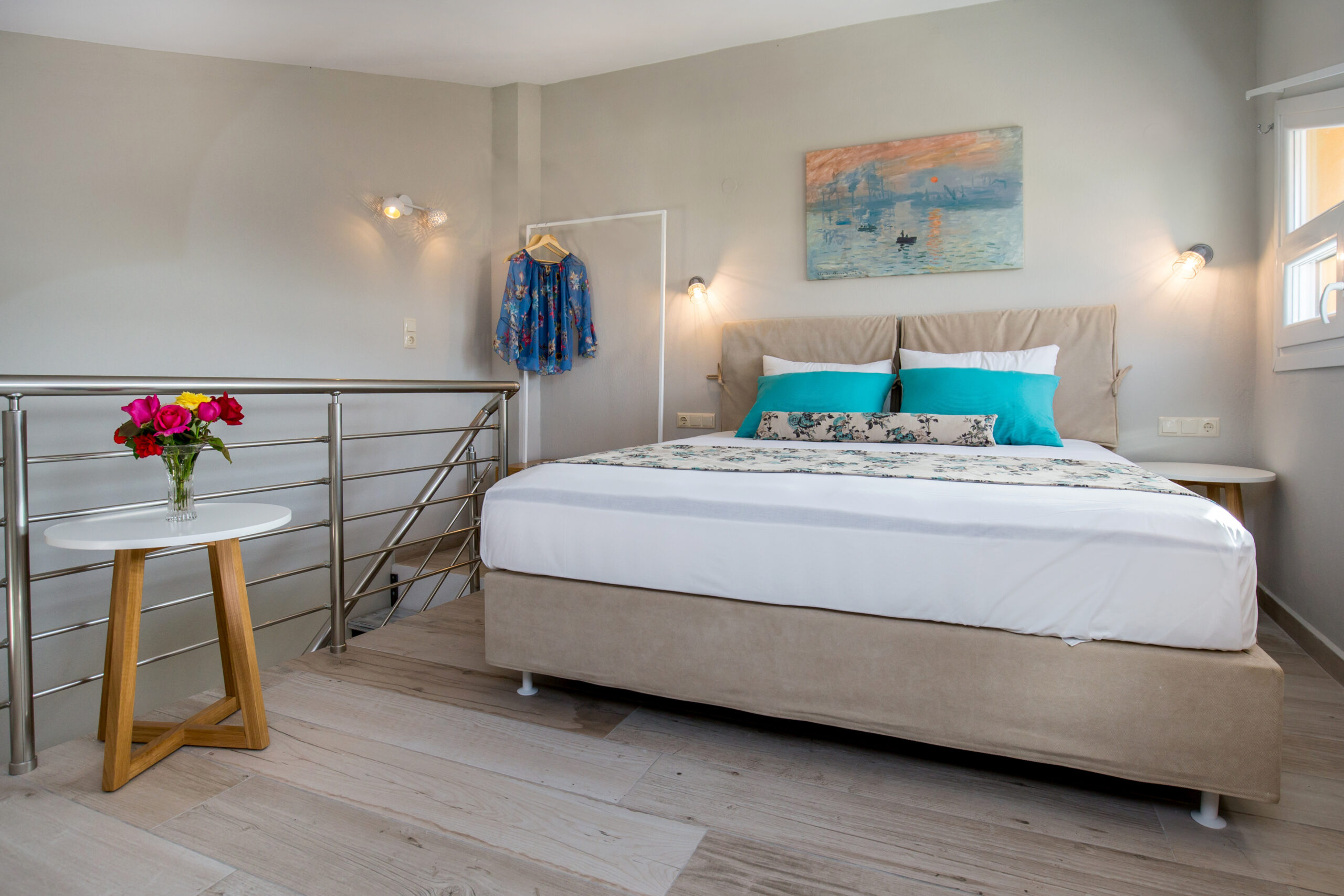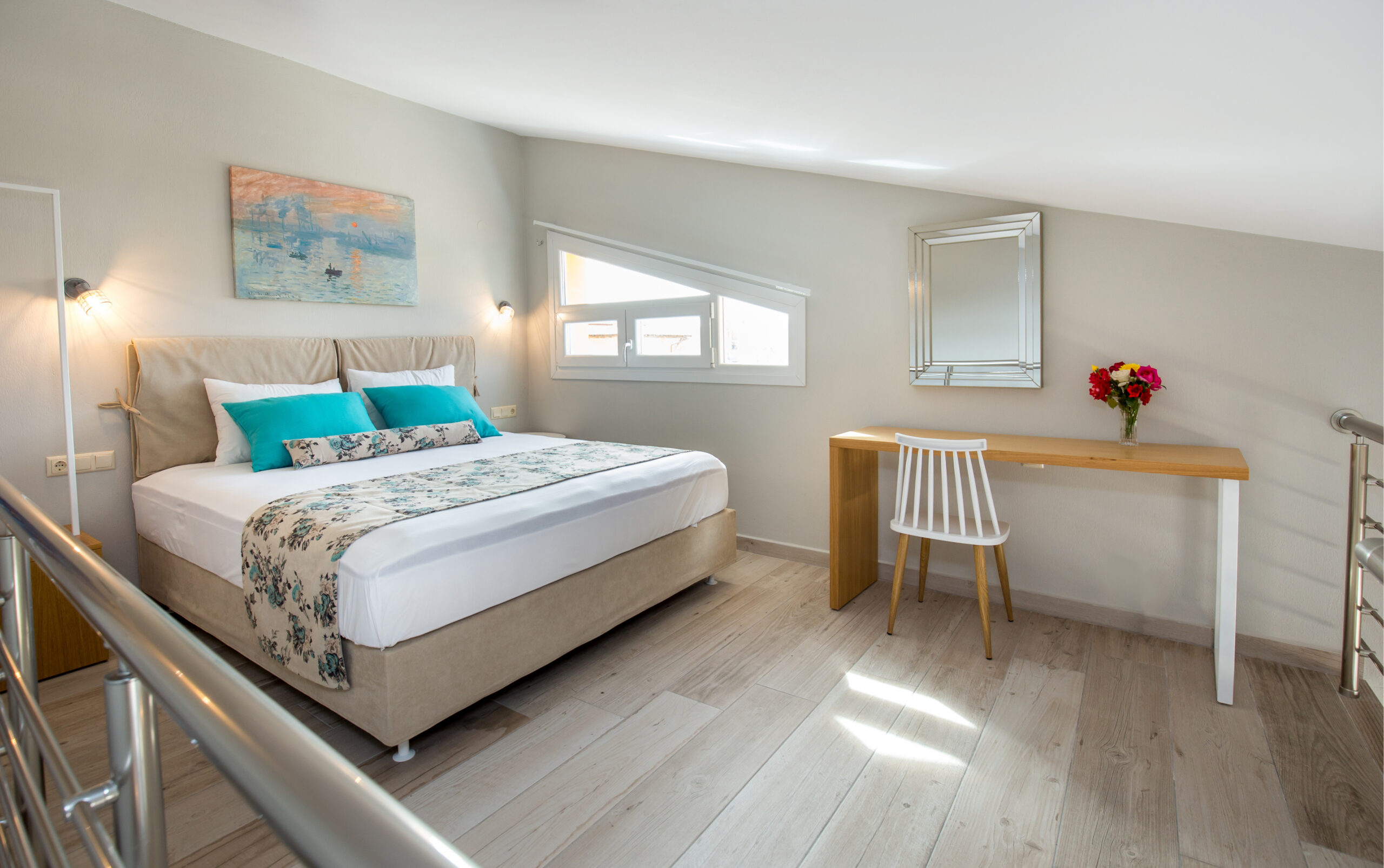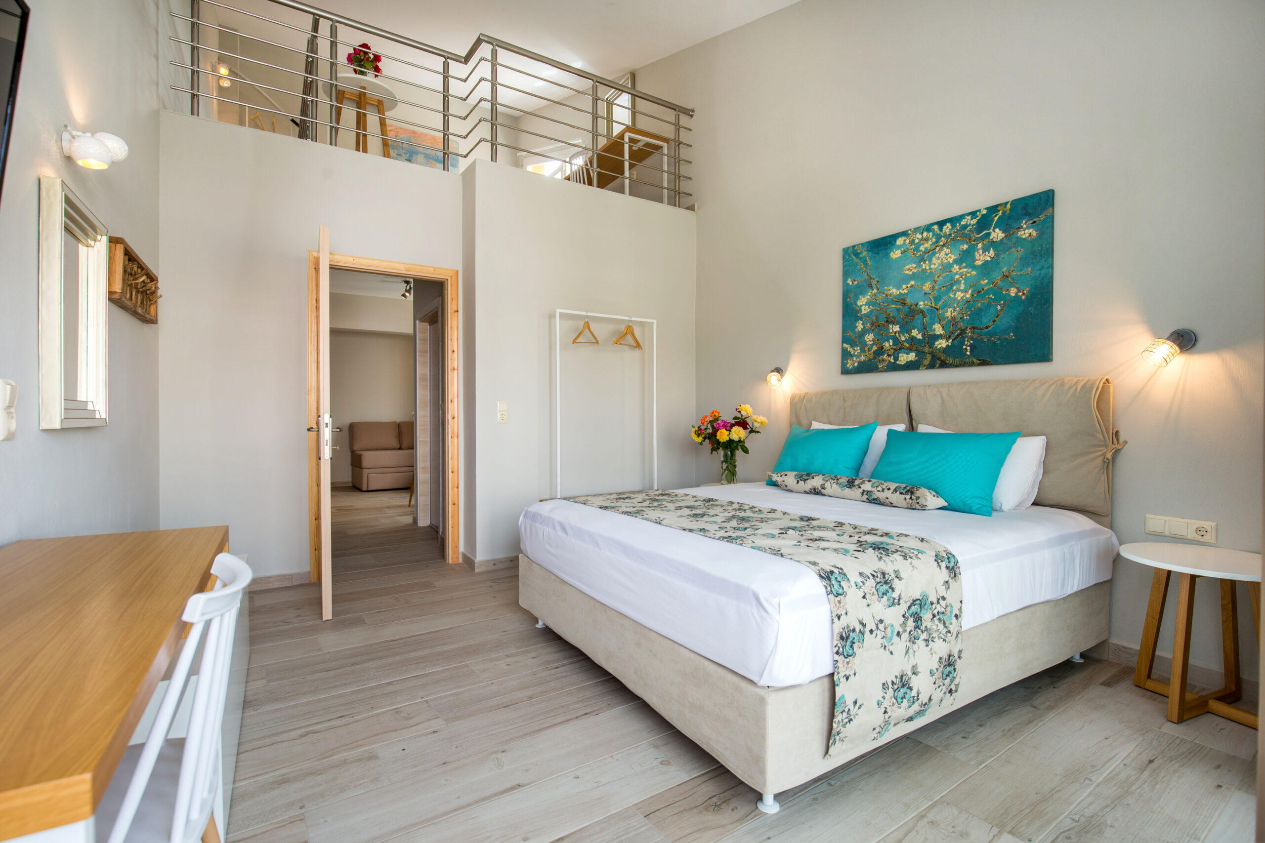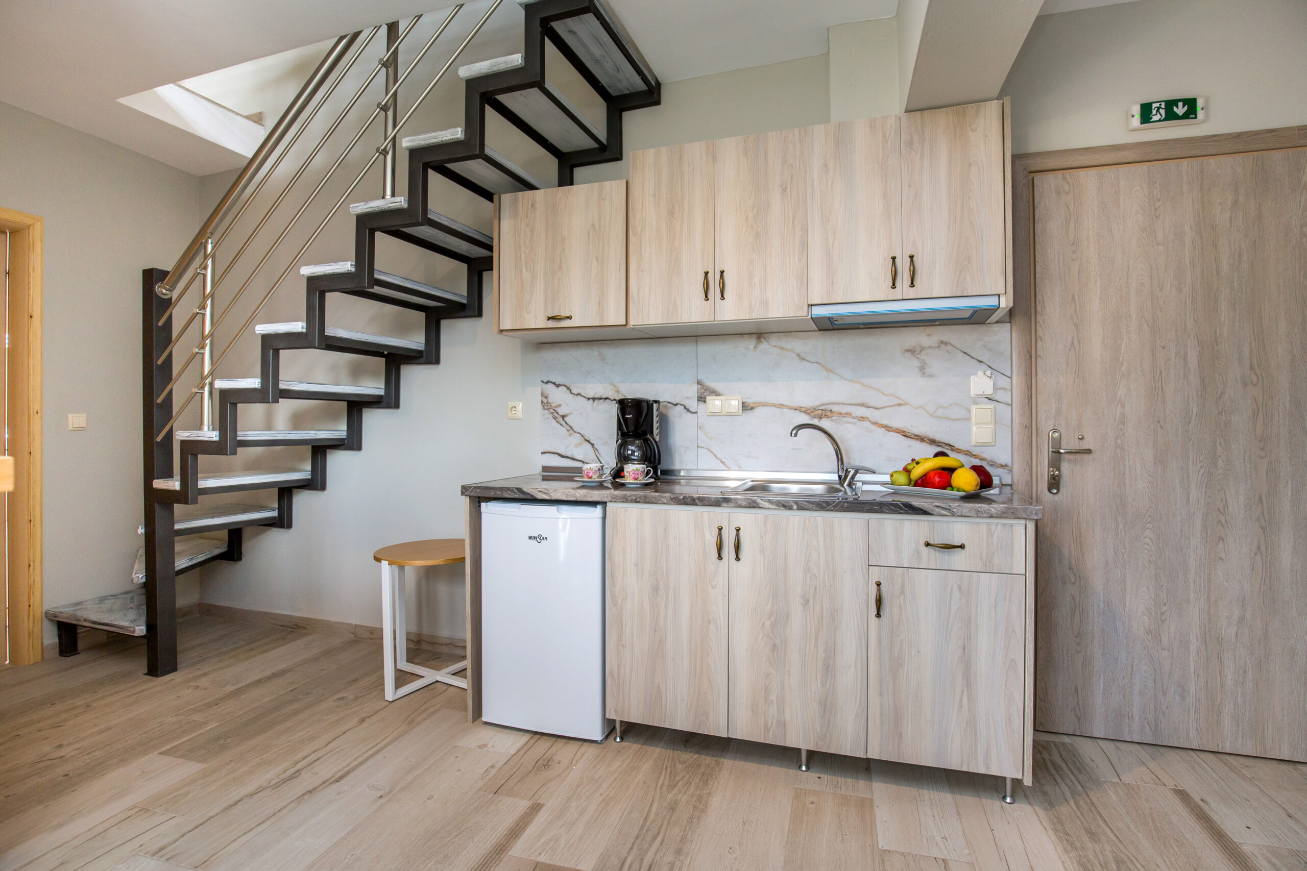 This apartment provides exceptional accommodation for families or groups of friends, since it can accommodate up to six persons. It features a spacious living room with a sofa bed, a modern, fully equipped kitchen with all the necessary kitchen utensils and a bar counter with chairs. The main bedroom features a double bed. The windows that surround the entire apartment capture the natural light. It also has a modern en-suite bathroom. The access to the upper floor is from the staircase at the kitchen. The upper floor also features a double bed. Lastly, the apartment has direct access to a spacious furnished balcony, overlooking the village and the beautiful natural surroundings.