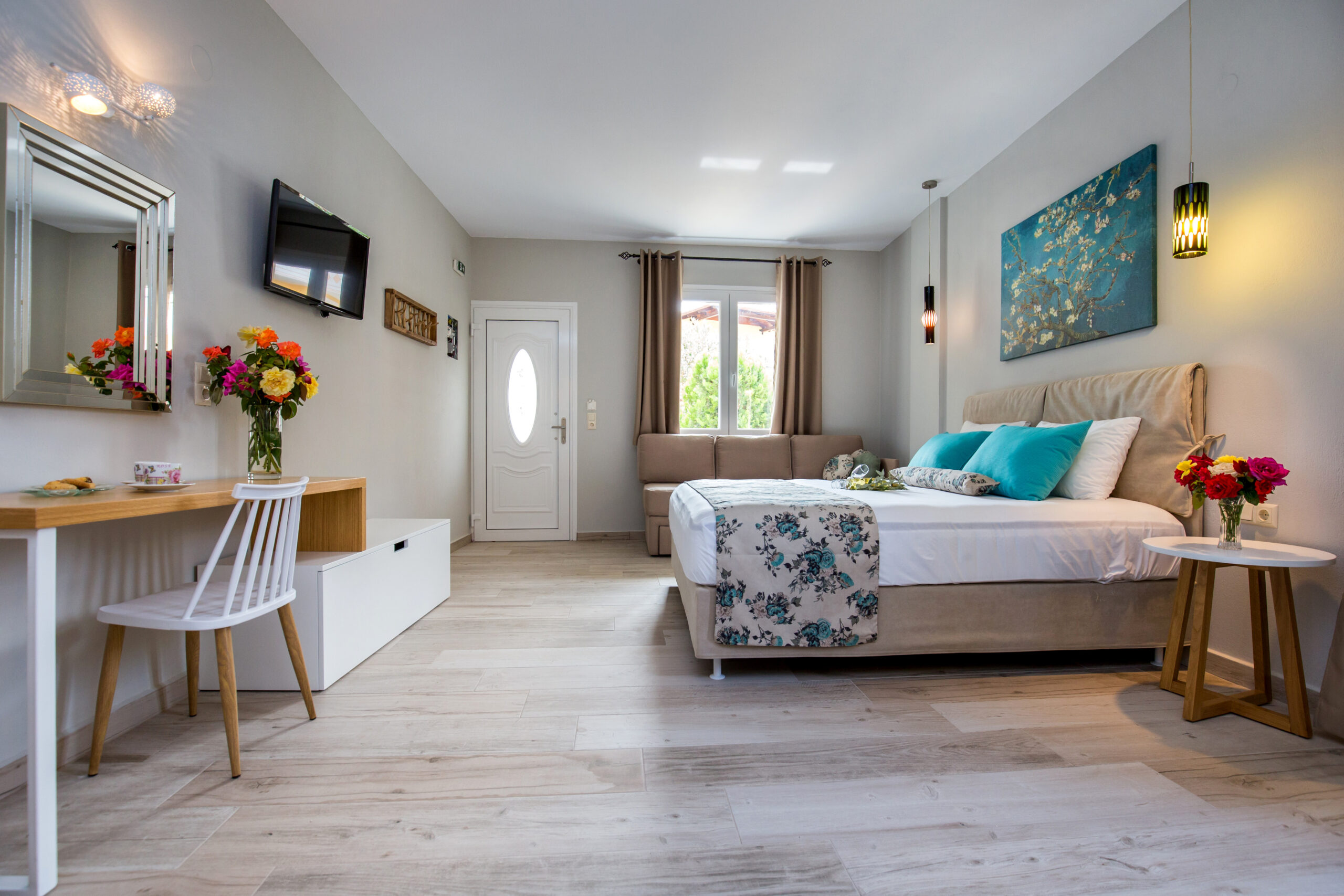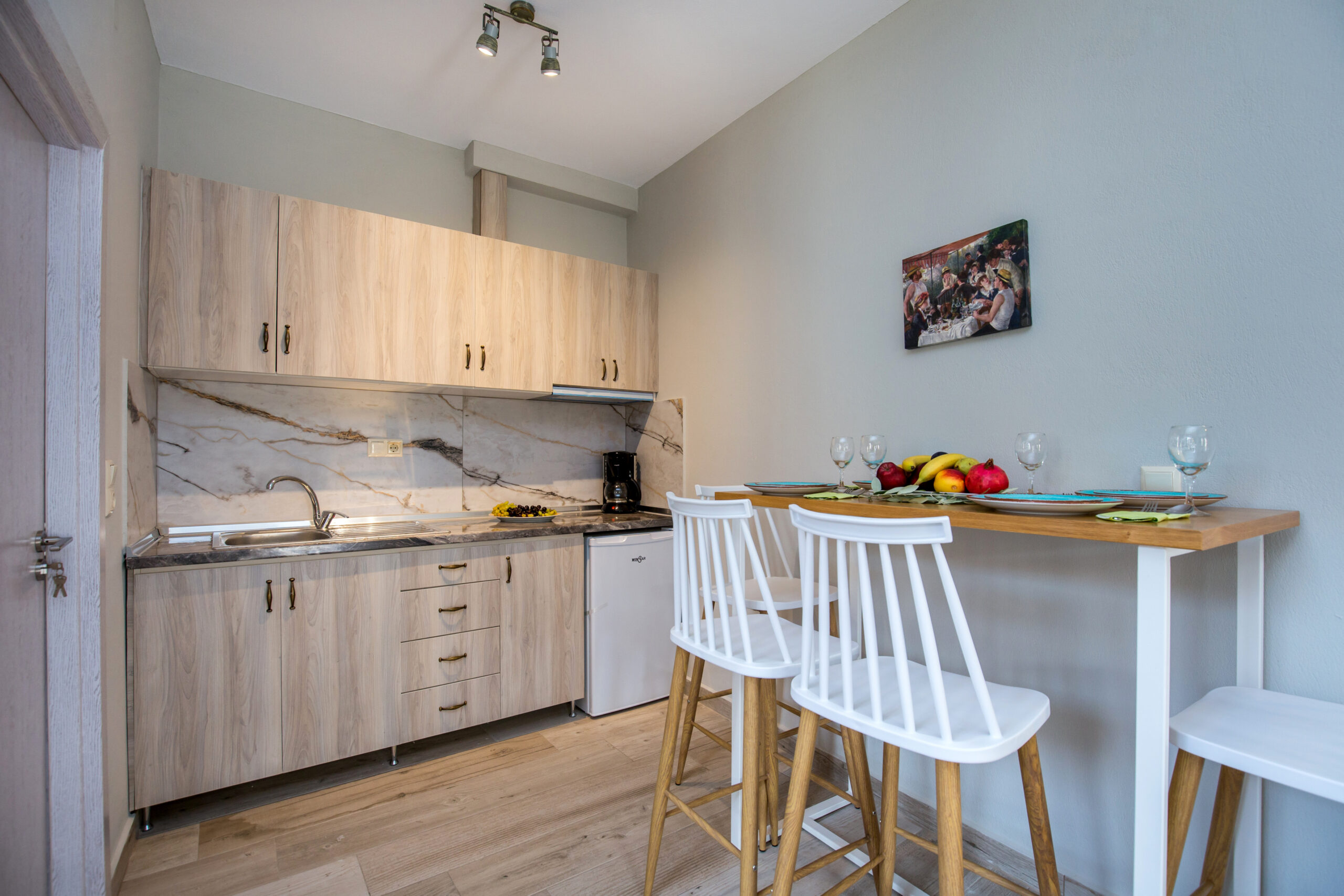 This studio provides exceptional accommodation for families, since it can accommodate up to three persons. It features a sofa bed, a double bed and a dressing table. It also has a modern, fully equipped kitchen with all the necessary kitchen utensils and a bar counter with chairs. The window that surrounds the entire apartment captures the natural light. It also has a modern en-suite bathroom with shower.