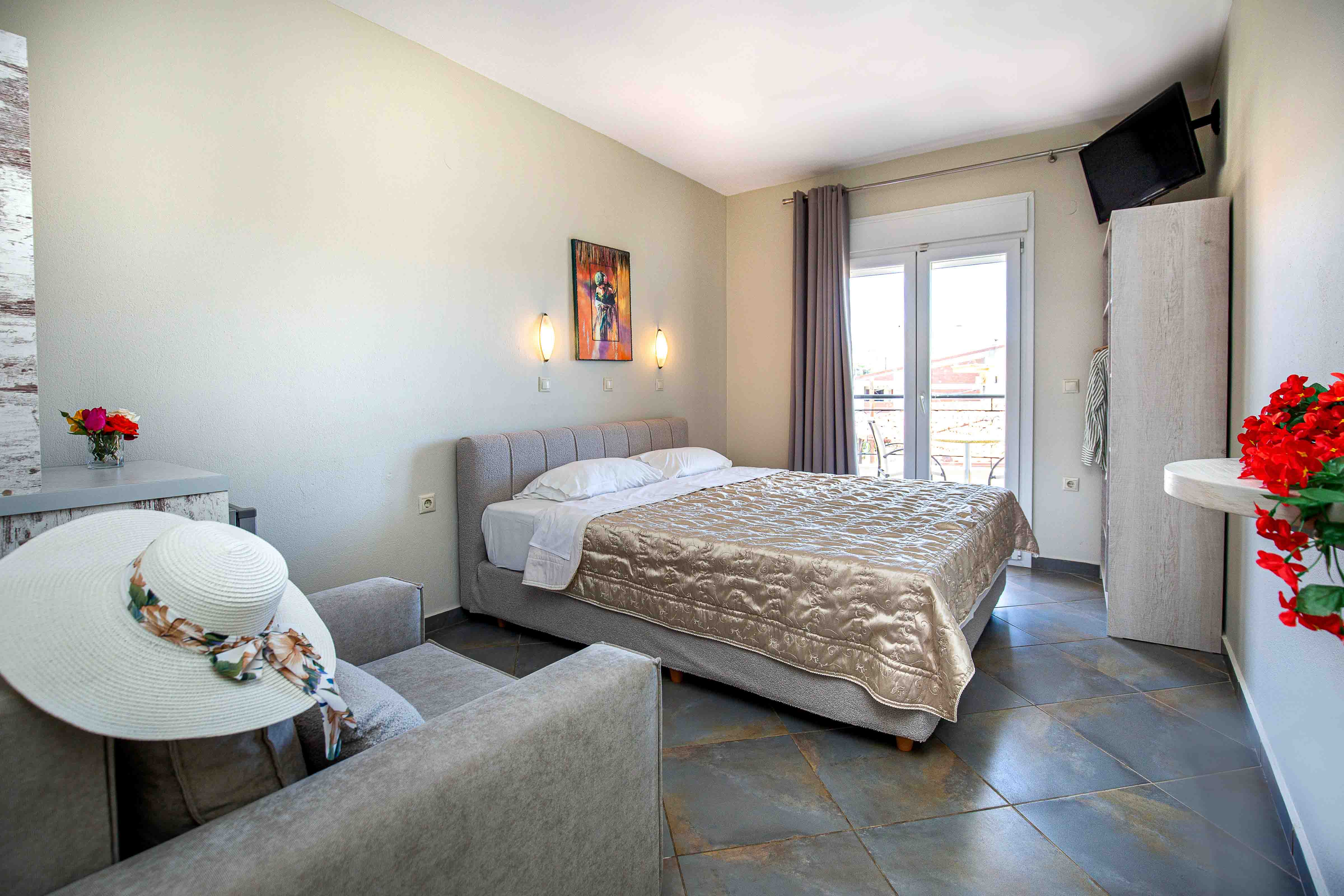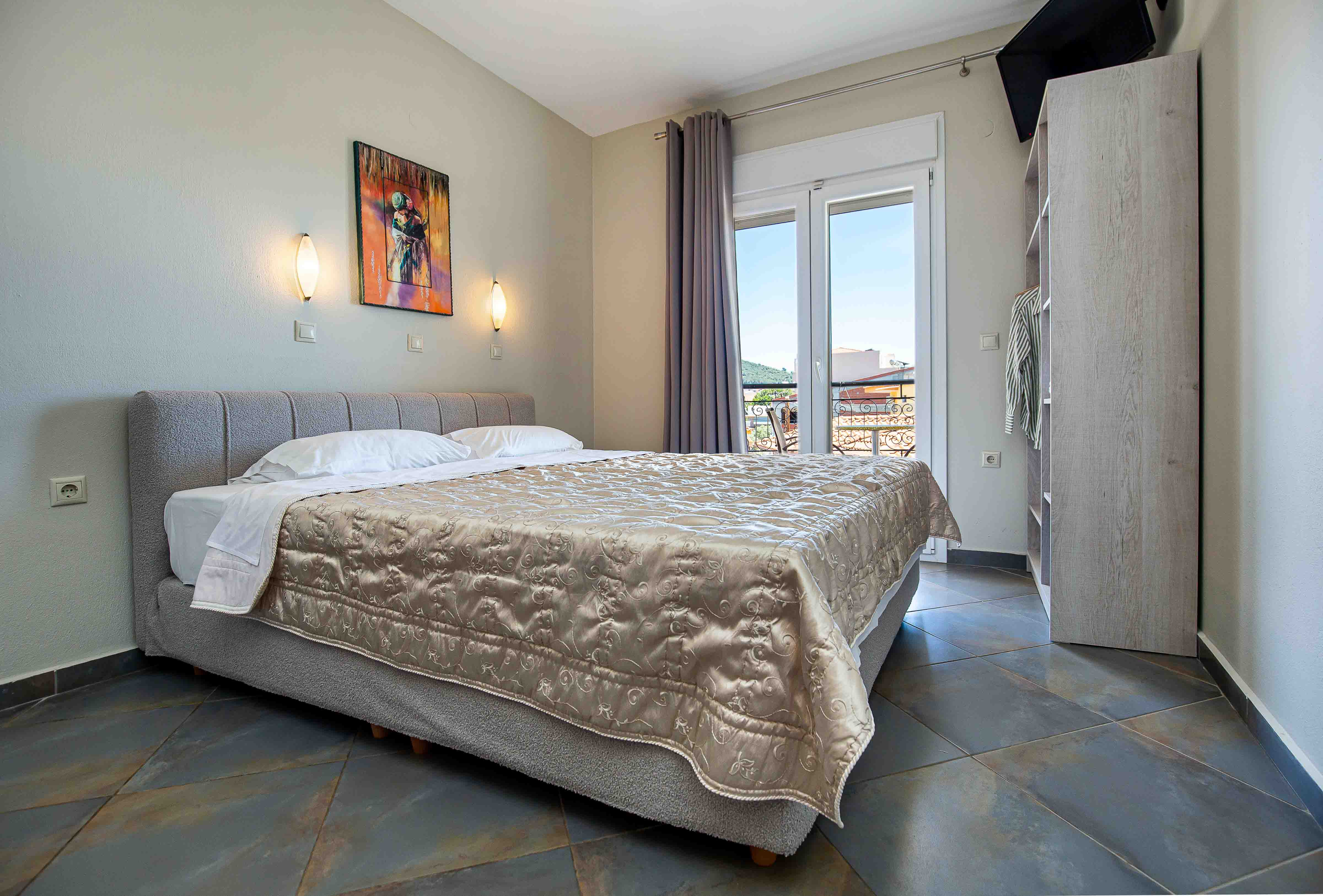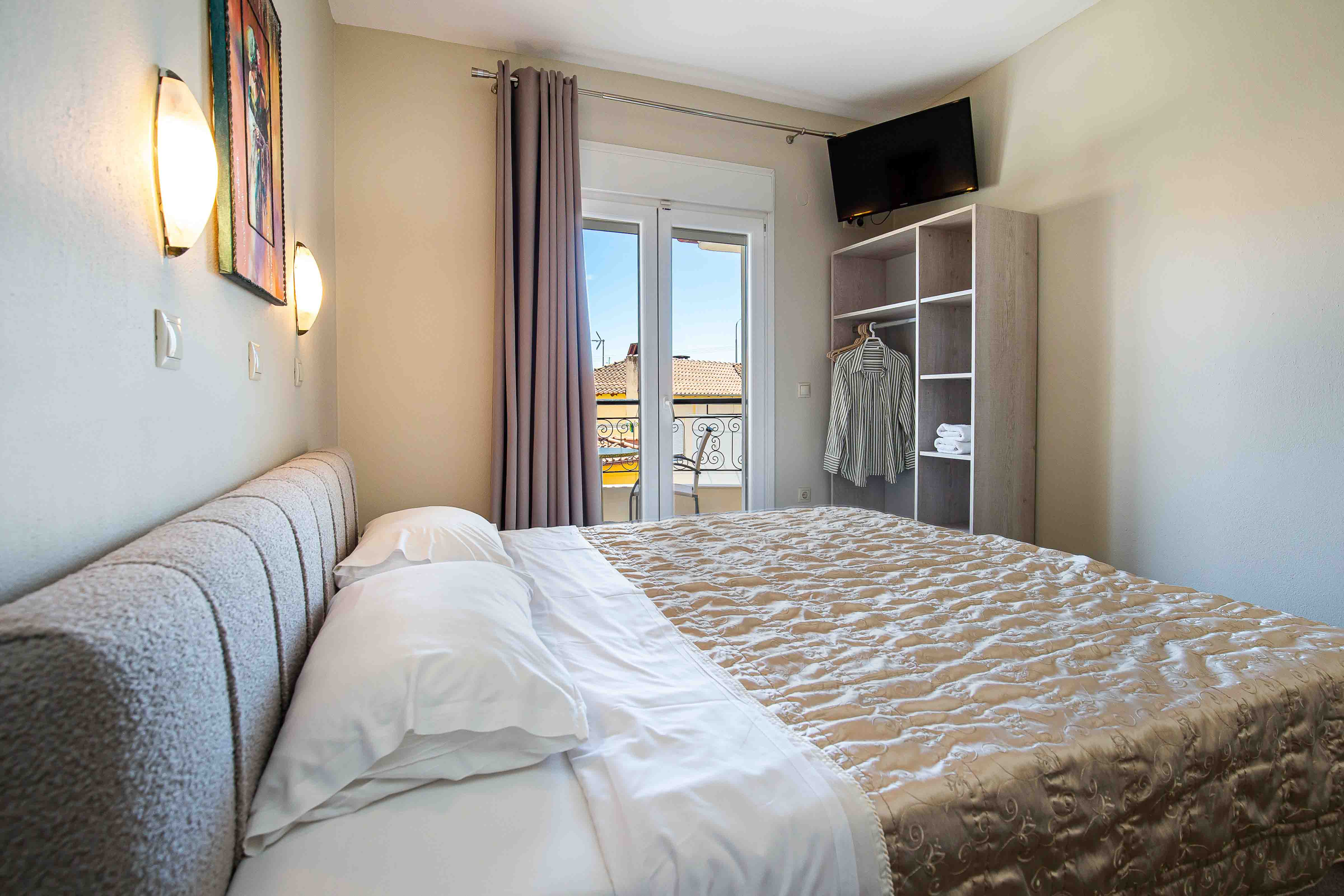 The studio is cozy and can accommodate up to tree adults. It features a comfortable double bed and an extra sliding bed, it also has a small kitchen area equipped with a kitchenette and an en-suite bathroom with a shower. Lastly, the studio has direct access to a furnished balcony overlooking the village and the beautiful natural surroundings. The studio offers all the necessary amenities that will make you feel right at home.