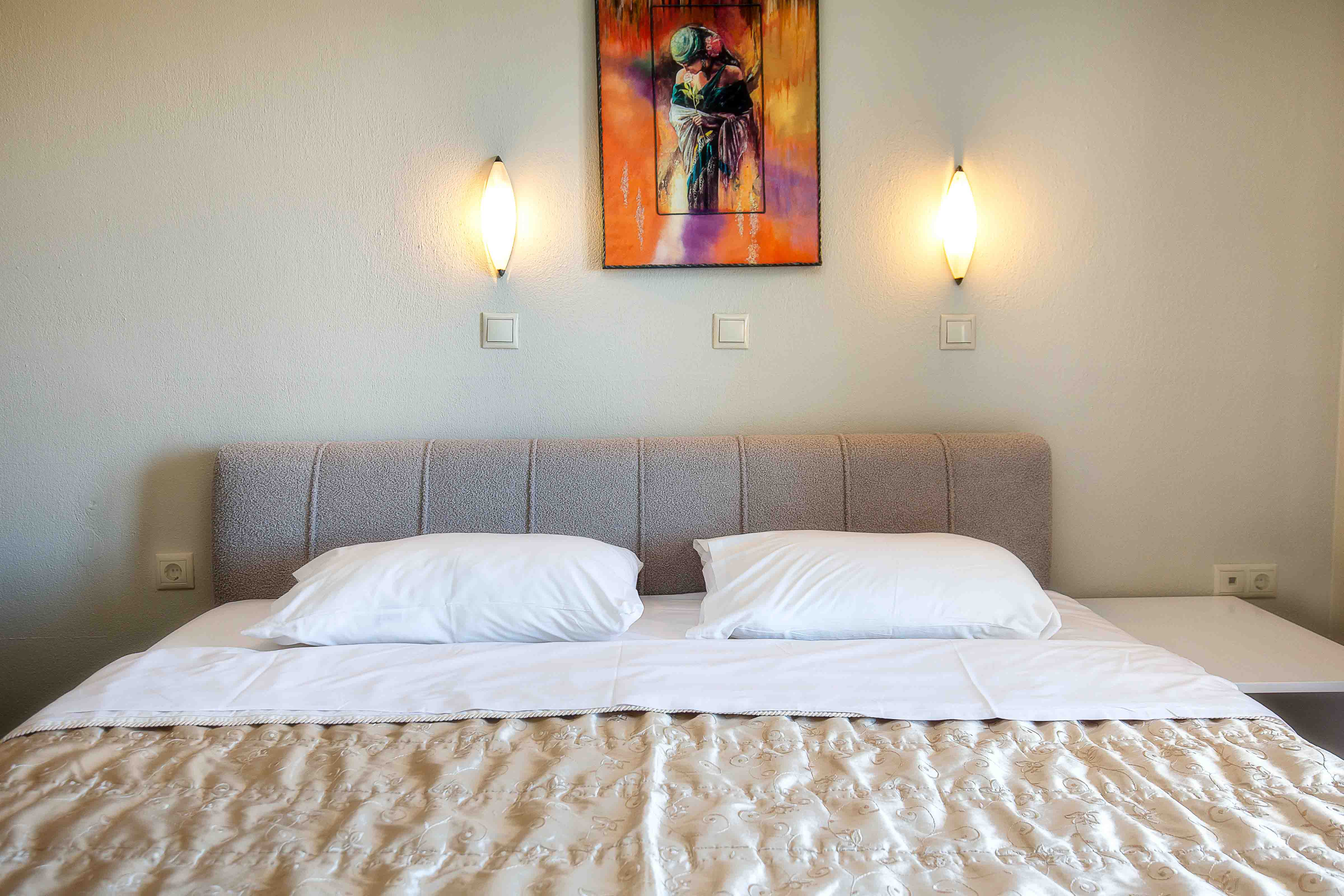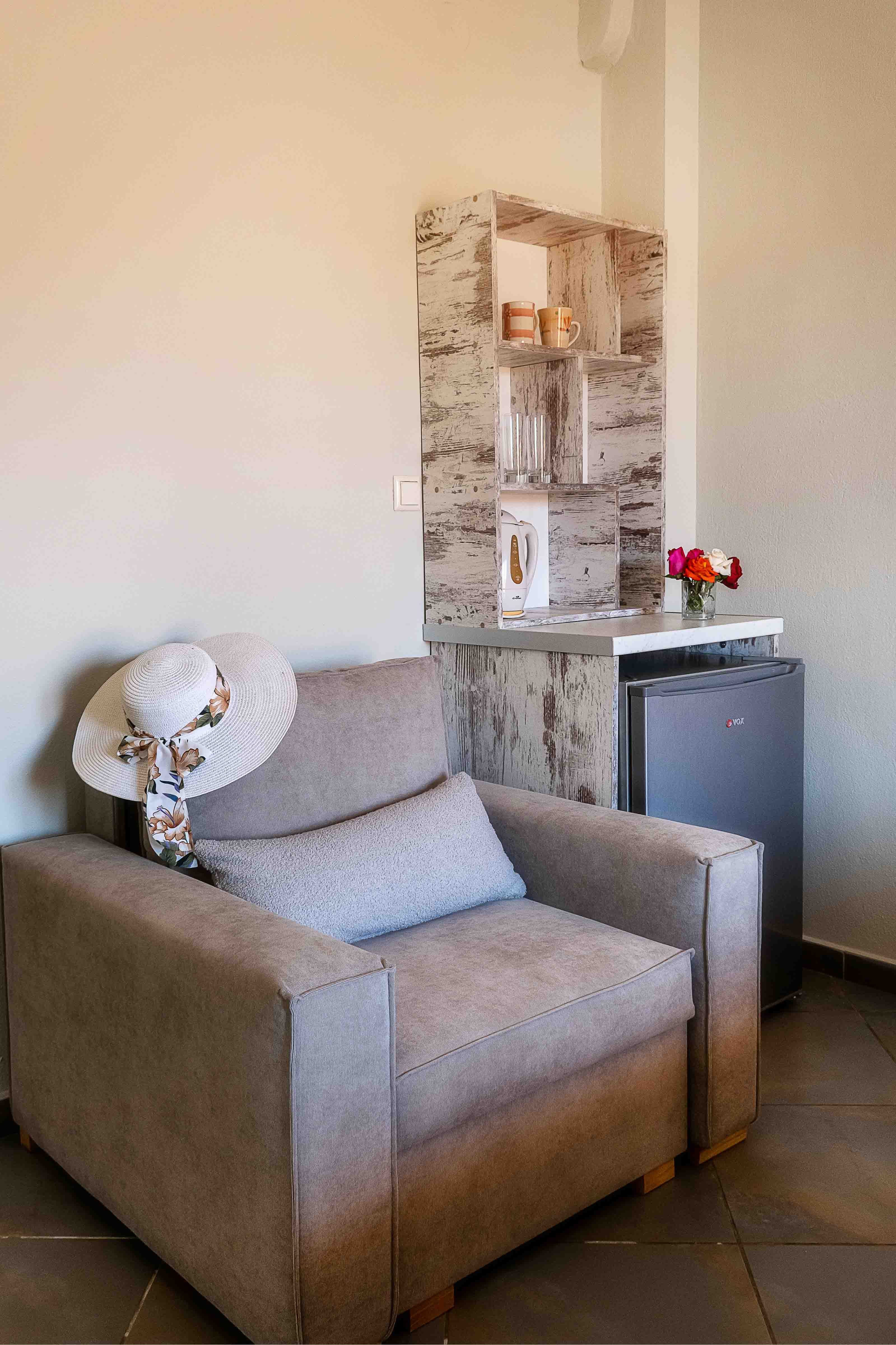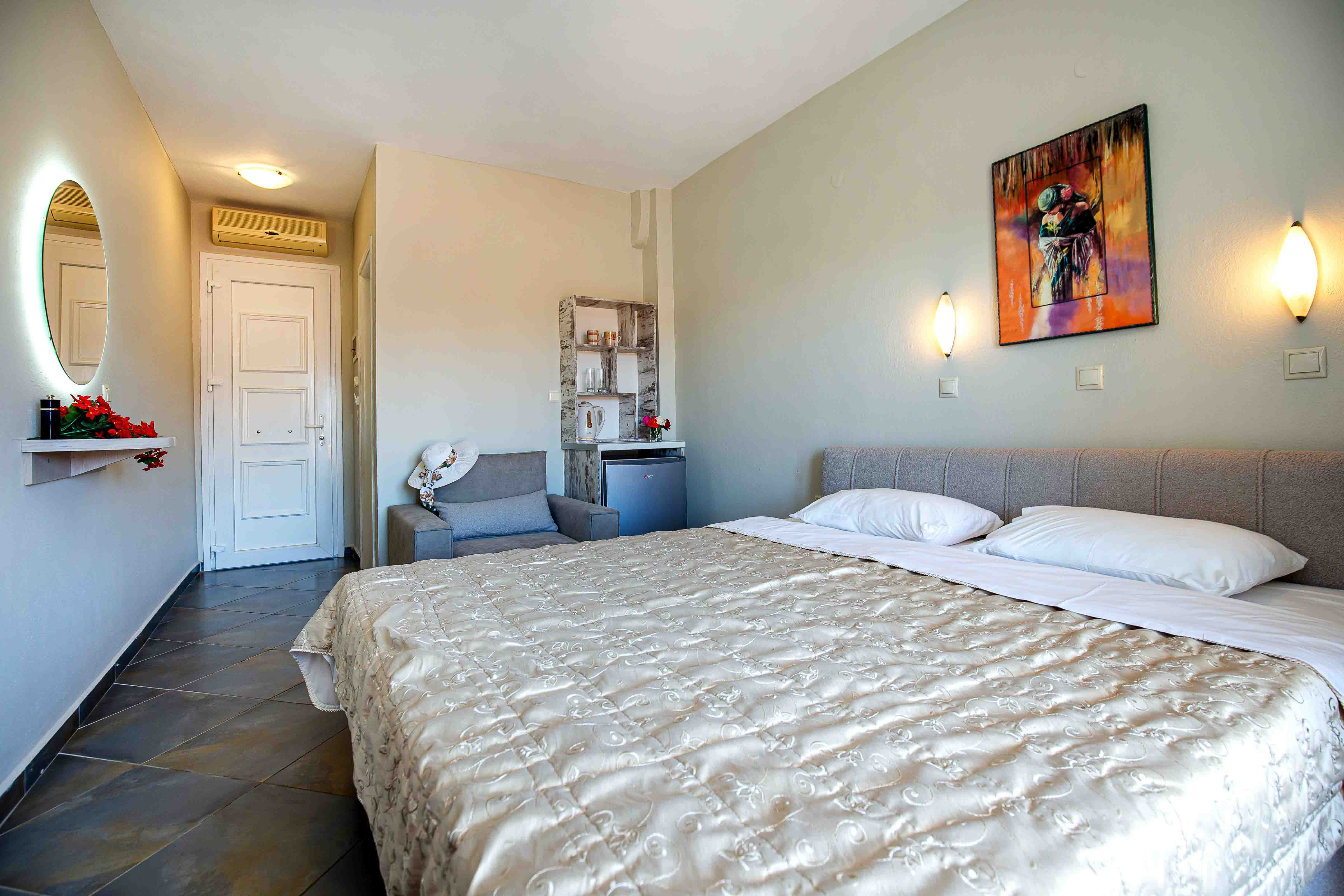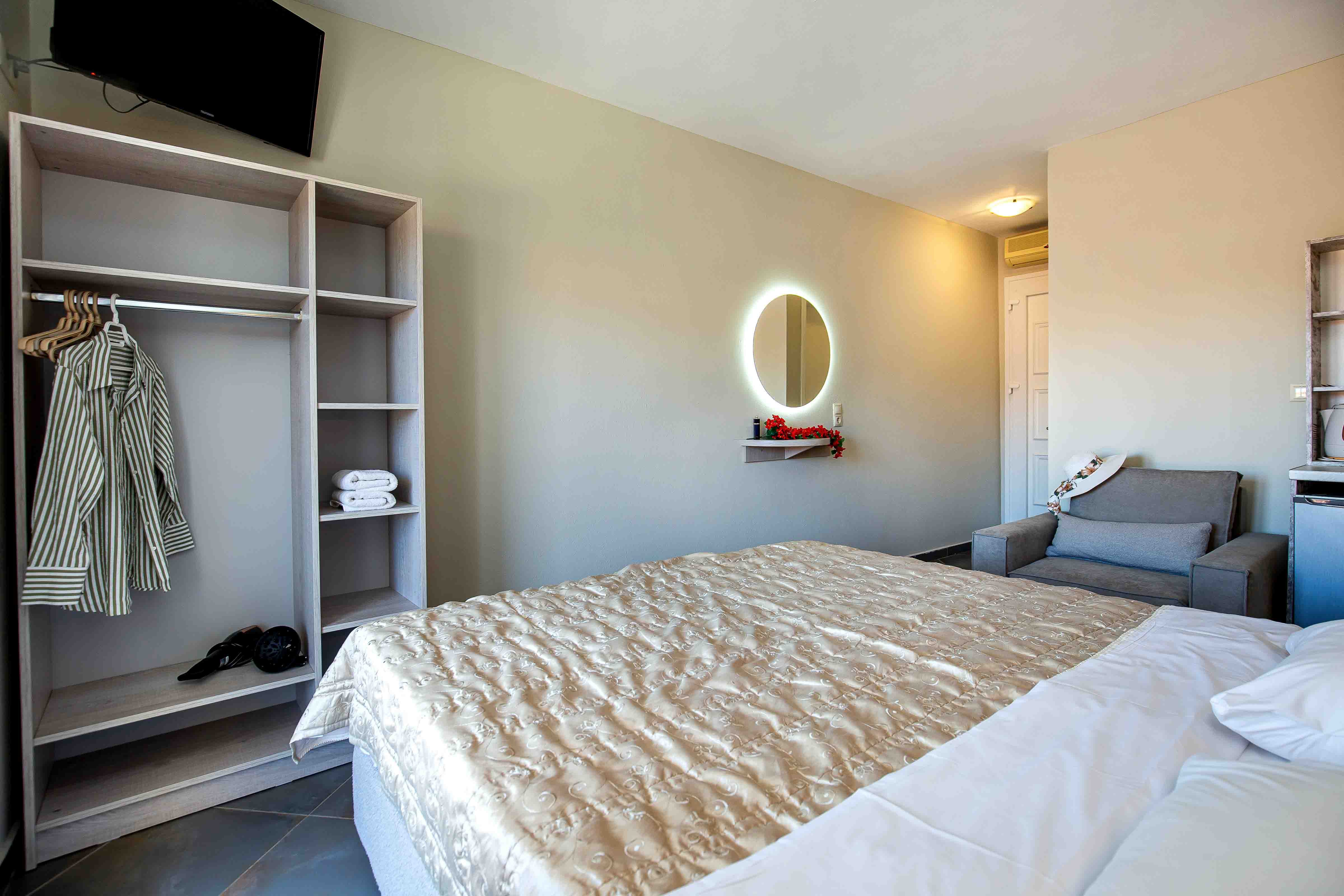 The studio is cozy and can accommodate up to tree adults. It features a comfortable double bed and an extra sliding bed, it also has a small kitchen area equipped with a kitchenette and an en-suite bathroom with a shower. Lastly, the studio has direct access to a furnished balcony overlooking the village and the beautiful natural surroundings. The studio offers all the necessary amenities that will make you feel right at home.
